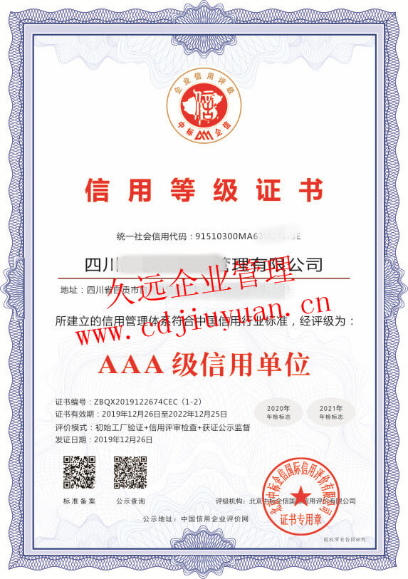 AAA級企業(yè)信用等級證書